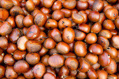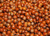 Dojrzałe kasztany z bliska. Surowe kasztany na Święta. Świeży kasztan. Castanea sativa wiew górny. Kontekst żywności.