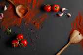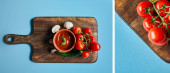 kolaż pudełka z grzybami, pomidorami wiśniowymi, kalafiorem i rozmarynem w pobliżu sosu pomidorowego w misce na czarno
