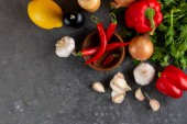 widok z góry miski z czerwonym pomidorem i sosami musztardowymi w pobliżu dojrzałych warzyw na czarno