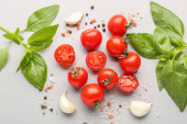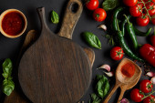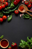 selektywne skupienie się na organicznych pomidorach wiśniowych, ząbkach czosnku, drewnianych łyżeczkach z proszkiem papryki i zielonych liściach bazylii na czarnym