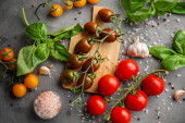 Zdjęcie "selektywne skupienie się na organicznych pomidorach wiśniowych, ząbkach czosnku, drewnianych łyżeczkach z proszkiem papryki i zielonych liściach bazylii na czarnym" może być wykorzystywane do celów osobistych i komercyjnych zgodnie z warunkami zakupionej licencji Royalty-free. Obraz jest dostępny do pobrania w jakości wysokiej rozdzielczości do 5760x3840.
