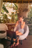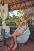 Nowoczesna, niezależna młoda kobieta używająca telefonu komórkowego / laptopa i pijąca kawę na kanapie tarasowej.
