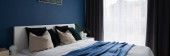 Zdjęcie "Panorama prostej sypialni z dużym oknem z zasłonami i wygodnym łóżkiem" może być wykorzystywane do celów osobistych i komercyjnych zgodnie z warunkami zakupionej licencji Royalty-free. Obraz jest dostępny do pobrania w jakości wysokiej rozdzielczości do 5760x3840.