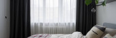 Panorama prostej sypialni z dużym oknem z zasłonami i wygodnym łóżkiem
