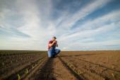 Wiosną młodzi rolnicy badający sadzonkę młodej soi