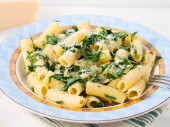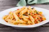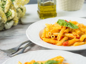 Makaron Penne ze świeżymi pomidorami i bazylią na stole