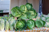 Uroczysty rynek rolny. Jednym z liczników ze świeżymi warzywami jest cukinia, kapusta, sałatka, kolendra i wiele innych. Właściciel lady obsługuje klientów.