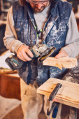 mężczyzna stolarz praca na stary drewno w retro vintage warsztat.