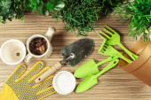Narzędzia ogrodnicze i sprzęt na białym drewnianym tle. Przygotowuję się do sezonowej transplantacji roślin. Sadzenie w koncepcji ogrodu.