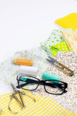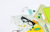 Zestaw kolorowych tkanin żółto-zielonych, nożyczki, guziki, szpule nici i okulary na białym. Koncepcja krawiectwa, mozaiki i robótki ręcznej. Igły i szycie.