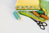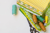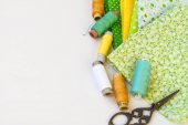 Zdjęcie "Zestaw kolorowych tkanin żółto-zielonych, nożyczki, guziki, szpule nici i okulary na białym. Koncepcja krawiectwa, mozaiki i robótki ręcznej. Igły i szycie." może być wykorzystywane do celów osobistych i komercyjnych zgodnie z warunkami zakupionej licencji Royalty-free. Obraz jest dostępny do pobrania w jakości wysokiej rozdzielczości do 5760x3840.