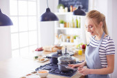 Piękna młoda kobieta gotowanie w kuchni w domu