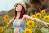 Kobieta w różowej sukience pozowała z dwoma słonecznikami na głowie