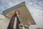 piękna dziewczyna z czerwonym płaszczu rozmowy na telefon