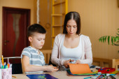Widok z boku matka rysunek na papierze w pobliżu syna gospodarstwa ołówki kolor na kanapie w domu