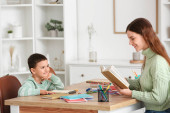 Selektywne skupienie uśmiechniętego chłopca wskazującego palcem podczas czytania książek z matką na kanapie