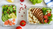 Bulgur z grillowanym filetem z kurczaka, świeże warzywa, awokado, zielenina. Dietetyczny lunch. Zdrowa żywność.