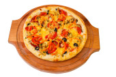 apetyczny pizza z drewniana taca serów z bliska na biały ba