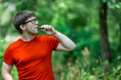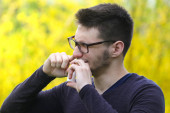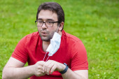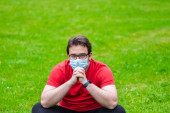 Mężczyzna z fryzurą kwarantanny nosi chirurgiczną maskę na zewnątrz, aby zapobiec się od wirusa korony
