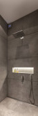 Nowoczesna łazienka z prysznicem otwartym na sypialnię, zarówno z betonowymi płytkami ściennymi