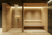 Zdjęcie "Nowoczesna łazienka z prysznicem otwartym na sypialnię, zarówno z betonowymi płytkami ściennymi" może być wykorzystywane do celów osobistych i komercyjnych zgodnie z warunkami zakupionej licencji Royalty-free. Obraz jest dostępny do pobrania w jakości wysokiej rozdzielczości do 5760x3840.