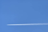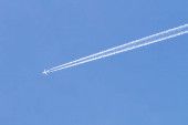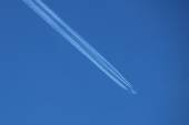 Samolot pasażerskiego odrzutowca przelatujący przez głębokie błękitne niebo pozostawiając długi biały strumień odrzutowy biegnący za sobą.