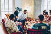 Szczęśliwa wesoła grupa młodych różnorodnych ludzi w luźnej odzieży brzęczące butelki przy stole załadowane ctokens filiżanki kawy w przytulnym pokoju