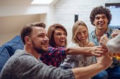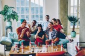 Radosna, wieloetniczna grupa młodych, zrelaksowanych, uśmiechniętych ludzi pijących i brzęczących butelek przy stole z pizzą w przytulnej świetlicy