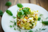 świeża sałatka z serem wiejskim z ogórkami i pomidorami z ziołami w misce na stole