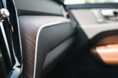 mężczyzna ręka na skórzanym siedzeniu w salonie samochodowym, widok z bliska