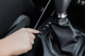 mężczyzna ręka na skórzanym siedzeniu w salonie samochodowym, widok z bliska