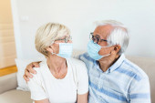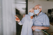 widok z tyłu smutna para starszych w maskach medycznych patrząc przez okno podczas samoizolacji