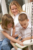 matka, czytając książkę na jej dwóch uroczych blond dzieci się w parku