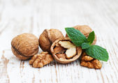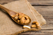 wiele orzechów nerkowca z zielonym liściem na drewnianym stole