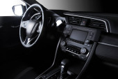 Wnętrze samochodu. Nowoczesny prędkościomierz samochodowy, podświetlana deska rozdzielcza i kierownica.