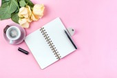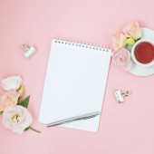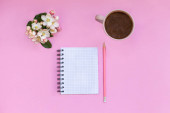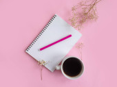 Notatnik do notatek leży na różowym tle, obok pióra, kawy i kwiatów. Planowanie czasu i robót osobistych