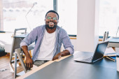 Afroamerykanin zamyślony pracownik myśli o zadaniu odwracając wzrok podczas przeglądania tabletu podczas zdalnej pracy przy biurku w pokoju