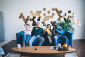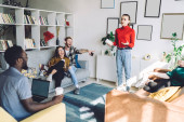 Kobieta w stroju casual przeglądanie smartfona podczas rozmowy z zainteresowanymi ludźmi jedzenie dostarczonej pizzy i siedzi na kanapie przy stole w stylowym mieszkaniu