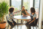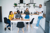 Zdjęcie "Kobieta w stroju casual przeglądanie smartfona podczas rozmowy z zainteresowanymi ludźmi jedzenie dostarczonej pizzy i siedzi na kanapie przy stole w stylowym mieszkaniu" może być wykorzystywane do celów osobistych i komercyjnych zgodnie z warunkami zakupionej licencji Royalty-free. Obraz jest dostępny do pobrania w jakości wysokiej rozdzielczości do 5760x3840.
