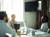Pewni siebie młodzi, wielonarodowi współpracownicy biznesowi gromadzący się przy stole roboczym z urządzeniami i dokumentami w sali konferencyjnej z dużym telewizorem na potrzeby strategii planowania