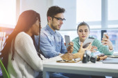 Zdjęcie "Wielokulturowi koledzy przeglądający informacje z mobilnej platformy od tysiącleci sprawdzający powiadomienia o instalacji, młodzi zróżnicowani pracownicy czytający wiadomości rynkowe na portalu społecznościowym połączonym z 4g" może być wykorzystywane do celów osobistych i komercyjnych zgodnie z warunkami zakupionej licencji Royalty-free. Obraz jest dostępny do pobrania w jakości wysokiej rozdzielczości do 5760x3840.