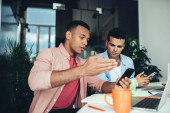Wielokulturowi koledzy przeglądający informacje z mobilnej platformy od tysiącleci sprawdzający powiadomienia o instalacji, młodzi zróżnicowani pracownicy czytający wiadomości rynkowe na portalu społecznościowym połączonym z 4g