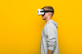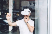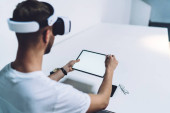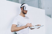 Uśmiechnięty młody brodaty mężczyzna w białej koszuli siedzący przy stole w wirtualnej rzeczywistości zestaw słuchawkowy podczas rysowania na tablecie za pomocą pióra
