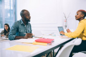 Afroamerykanie zajęci robotnikami wykonującymi papierkową robotę i robiącymi notatki podczas rozmowy o strategii marketingowej firmy przy stole biurowym