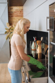 kolaż gospodyni domowej przygotowuje obiad, zmywa naczynia i trzyma pranie w pobliżu pralki