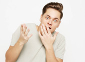 Portret kaukaskiego mężczyzny w zadziwiającym geście z zakryciem ust w niebieskim odizolowanym tle pracowni, wybiórczo skupiony