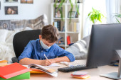 malutka dziewczynka w masce, odrabiająca lekcje, pisząca w notatniku, używająca laptopa, koncepcji e-learningu, podczas kwarantanny i samoizolacji. uczenie się w związku z pandemią Covid-19.