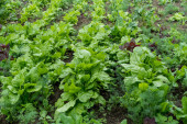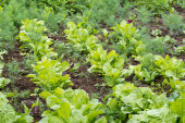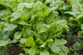 Duża grupa świeżych zielonych liści sałaty i buraków w organicznym ogrodzie, z niewielkimi kroplami wody w deszczowy letni dzień, piękne zewnętrzne monochromatyczne tło fotografowane z miękkim ostrością