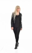 Portret ładnej dziewczyny z rudymi włosami w czarnych skórzanych spodniach i bluzce. Pełnowymiarowa pozycja stojąca w bocznym profilu izolowana na szarym tle studia