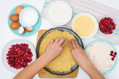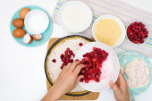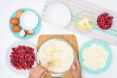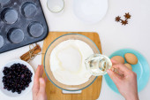 Krok po kroku przepis na babeczki z czarnymi porzeczek. przygotowanie ciasta, mieszanie składników mąki, masła, cukru, jaj, wanilii, porzeczki. widok z góry